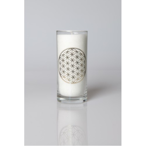 Glas-Kerze Blume des Lebens weiss 50h Brenndauer